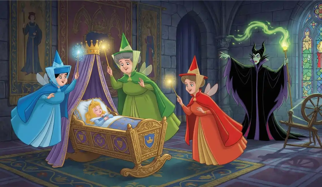 Long ago, in a beautiful kingdom, a princess named Aurora was born. At her christening, a wicked fairy named Maleficent cast a terrible curse: Aurora would fall into a deep sleep on her sixteenth birthday. Only true love’s kiss could awaken her.